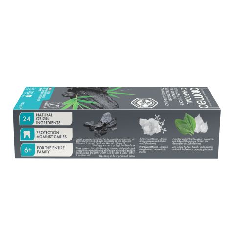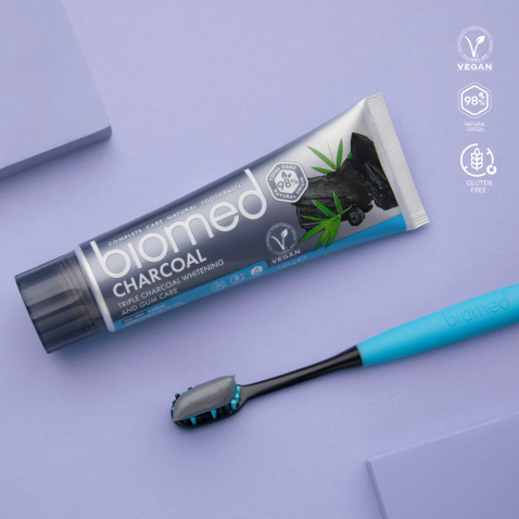 BIOMED CHARCOAL hammastahna, jossa on bambuhiilta, aktivihiilta seka puuhiilta, kirkastaa hampaita hellasti. Vastustamaton hymy.